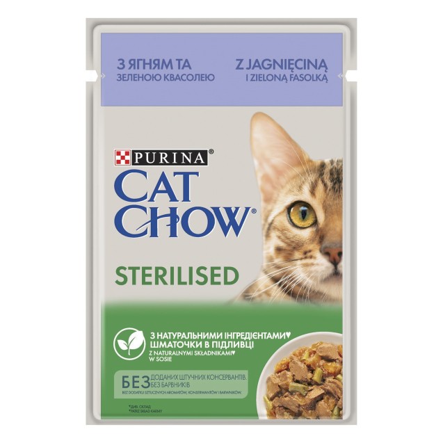 Cat Chow Sterilised - hrană umedă completă pentru pisici sterilizate și motani castrați, cu miel și fasole verde în jeleu.
