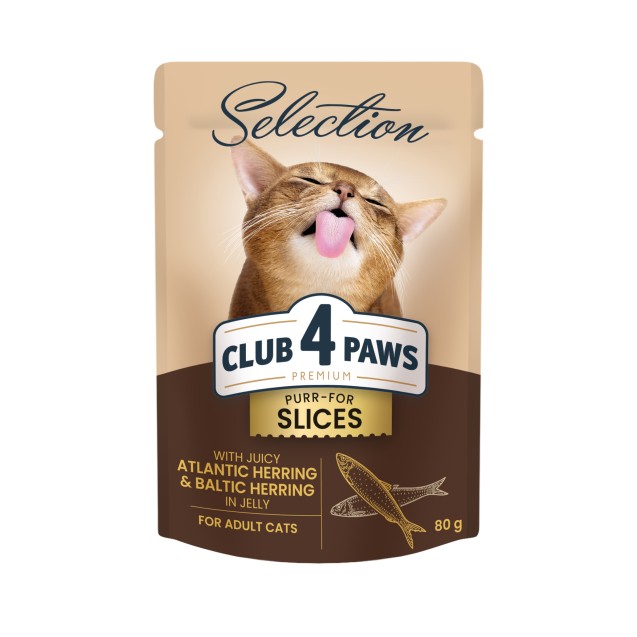 Club 4 Paws Selection Slices with Atlantic Herring & Baltic Herring, cu hering în jeleu pentru pisici, 80 g (12 bucăți)
