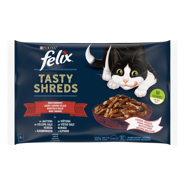 Felix Tasty Shreds, cu vită (2 bucăți) și cu pui (2 bucăți) pentru pisici, 320 g (4 bucăți)