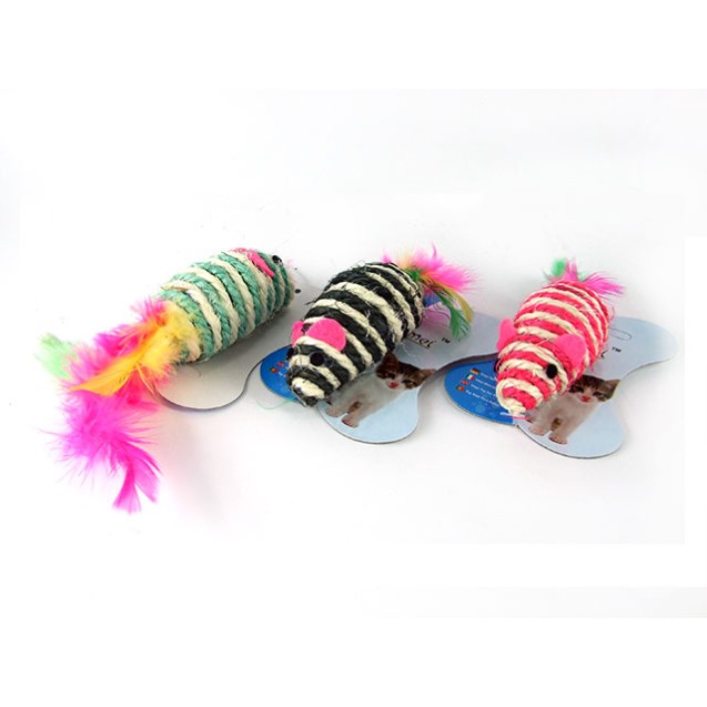 Jucărie ”Șoarece” de frâghie cu pene L-9cm (diferite culori)