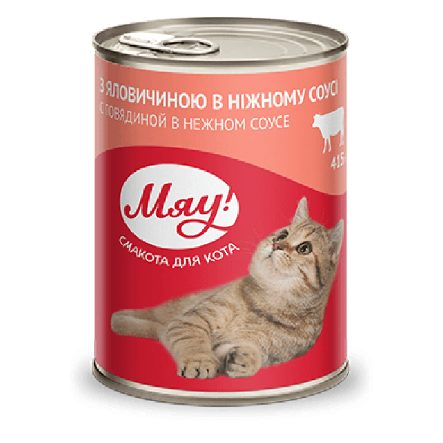 "Мяу!" conservele de vită într-un sos delicat pentru pisicile adulte combină bogăția gustului și o doză optimă de energie pentru fiecare zi.
