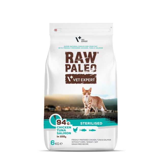 Raw Paleo Sterilised, cu pui, ton și somon pentru pisici, 6 kg