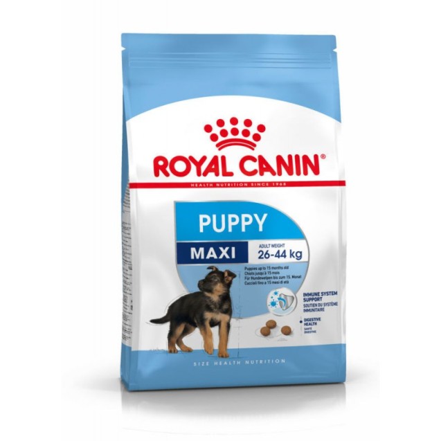 Royal Canin Maxi Puppy - hrană uscată completă pentru căței de talie mare, cu greutatea de adult cuprinsă între 26 și 44 kg și vârsta între 2 și 15 luni.