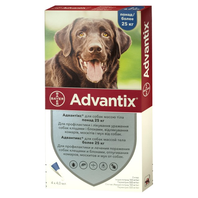Bayer Advantix este un antiparazitar extern sub forma de soluție pentru aplicare cutanata pentru câini cu greutate mai mare de 25 kg.