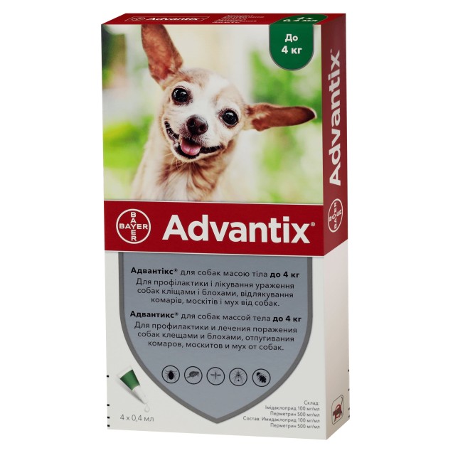 Bayer Advantix este un antiparazitar extern sub forma de soluție pentru aplicare cutanata pentru câinii cu greutate mai mica de 4 kg.
