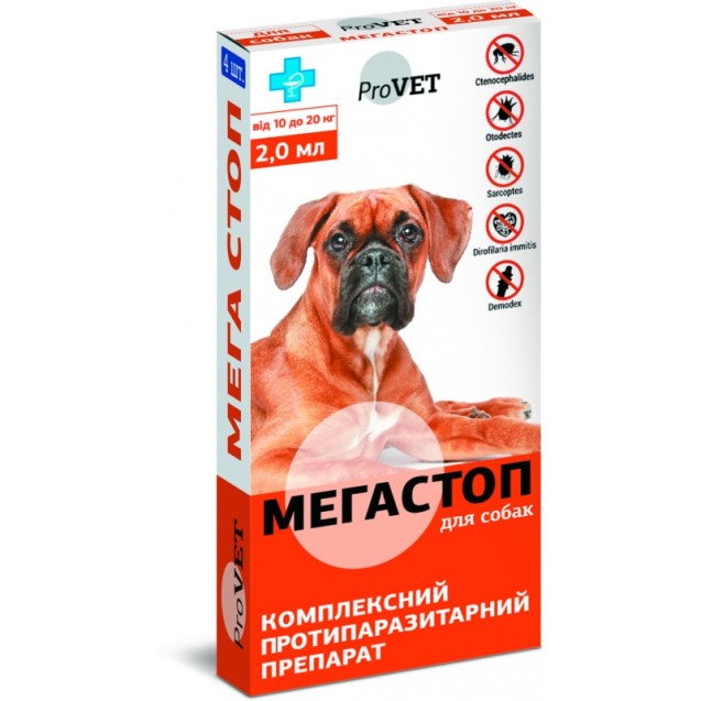 Un medicament eficient al unei noi generații pentru uz extern. MEGA STOP are o formă convenabilă SPOT-ON (picături pe greabăn), precum și o doză convenabilă de medicament, în funcție de specie (pisici și câini) și de greutatea animalului. MEGA STOP este prescris pisicilor și câinilor în scopuri profilactice și terapeutice în caz de infestare de purici, acarieni de scabie (Otodectes cynotis, Notoedres cati, Sarcoptes canis), acarieni demodectici, în caz de nematode intestinale, precum și pentru prevenirea dirofilariei. (eficient împotriva stadiului larvelor L3 și L4).