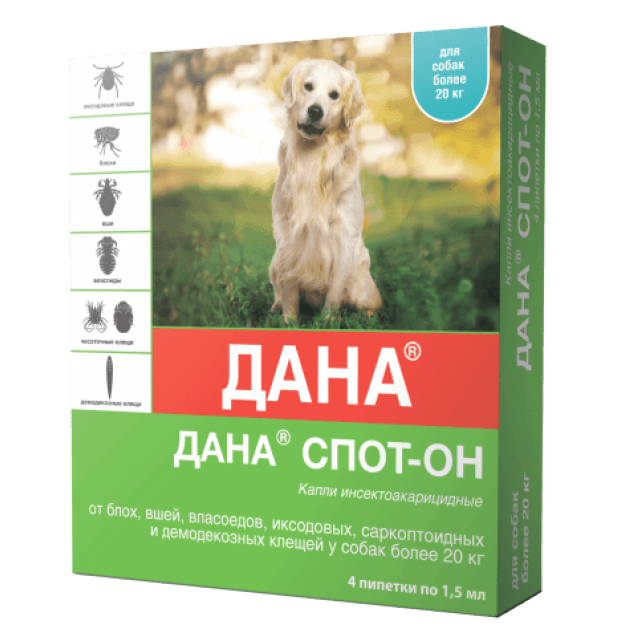 Dana Spot-on este prescris câinilor și pisicilor de la vârsta de 12 săptămâni pentru tratamentul și prevenirea entomozelor cauzate de purici, păduchi și păduchi, acaroza cauzată de sarcoptoizi, acarieni ixodici și demodectici, animale de blană - pentru tratamentul și prevenirea otodectozei.