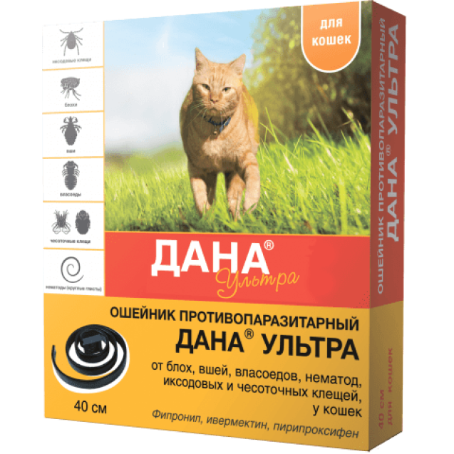 Gulerul antiparazitar Dana Ultra este utilizat la câini și pisici pentru tratamentul și prevenirea arahno-entomozelor cauzate de purici, păduchi, păduchi, căpușe ixodide, precum și pentru prevenirea otodectozei și a nematodelor tractului gastro-intestinal.