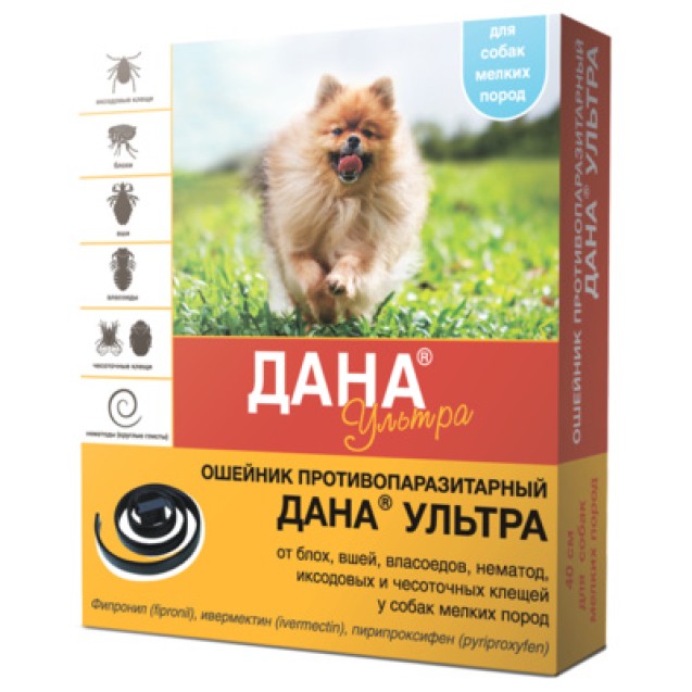 Gulerul antiparazitar Dana Ultra este utilizat la câini și pisici pentru tratamentul și prevenirea arahno-entomozelor cauzate de purici, păduchi, păduchi, căpușe ixodide, precum și pentru prevenirea otodectozei și a nematodelor tractului gastro-intestinal.