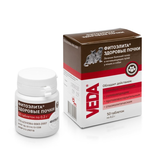Phytoelita Healthy rinichi este un medicament pentru pisici și câini, conținând ca ingrediente active extracte, decocturi și infuzii din materiale vegetale medicinale (ierburi de coadă de cal, coajă de rădăcină de afine, rădăcini de păpădie, frunze de mesteacăn, rădăcini mai înnebunite, plantă echinacea purpurea, frunze de urzică, plantă centaură, plantă violetă, flori dulci de luncă, rădăcini de brusture, rădăcini de lemn dulce și rizomi, conuri de hamei, flori de mușețel, plantă Lespedeca capitate, plantă ortosifonă staminată, muguri de picioare de mesteacăn, flori de mentă ardei, ierburi ale literelor medicinale, rizomi de calamus, rizomi și rădăcini de burnet, iarbă de șarpe, iarbă de paie, iarbă de iederă, oregano) - 3,78% și ca componente auxiliare lactoză, amidon, stearat de calciu, apă distilată.