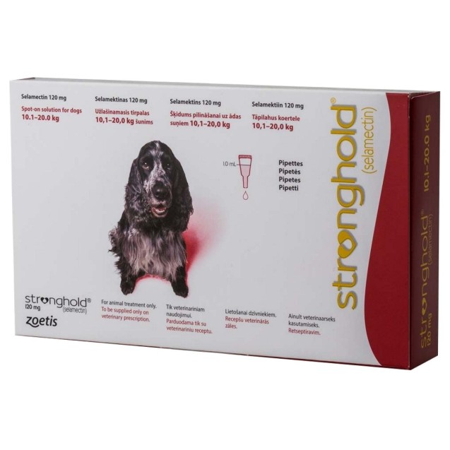 Stronghold 10,1-20,0 kg - este prescris câinilor cu scop terapeutic și profilactic pentru entomozele cauzate de purici, păduchi, otodectoză, râie sarcoptică.